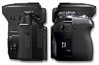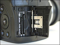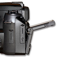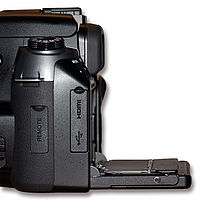 Odnímatelná krytka baterie je ve spodní části a podobně propracovaná jsou i dvířka na levém boku, pod, kterými se schovává slot pro Memory Stick a SD kartu. Jediná gumová dvířka jsou na pravé straně, kde jsou konektory pro dálkovou spoušť, USB a již standardně se objevující HDMI konektor.