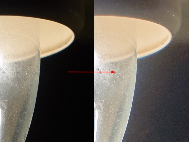 Vlevo je fotka vyvolaná z komprimovaného RAWu se zesvětlením – všimněte si ošklivých struktur na kontrastní hraně (100% výřez). Vpravo pak je stejně zpracovaná fotka z nekomprimovaného RAWu a z komprimovaného. Pokud hodláte silně zpracovávat kontrastní scény, kompresi si vypněte. Karty už jsou dneska velké a levné natolik, že šetřit megabajty za to nestojí.
