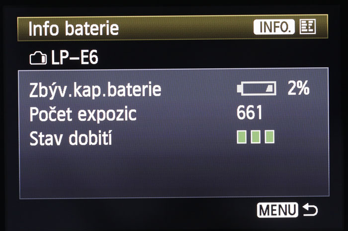 Naštěstí se nestalo jako mezi 5D a 5D MarkII, že by Canon změnil typ baterie. Dobrá zpráva je, že jak 5D Mark II i 5D Mark III používají stejné baterie typu LP-E6. Zůstává i stejný systém kontroly, kde si u každé baterie můžete zjistit procento nabití a jeden ze tří stupňů stavu baterie z hlediska efektivity dobíjecího cyklu (po dvou letech se mi u všech 4 baterií místo 3 čárek ukazují u Marka II jen dvě, kapacita je však pořád velmi dobrá – bez podrobného testu).
