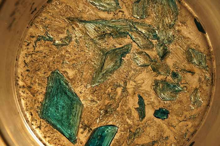 Focení krystalků skalice modré v procházejícím světle. U prvního snímku je špatně vyvážení bílé (automatický režim). U druhého je nastaveno manuálně na žárovku. Protože jde o focení z ruky, tak jsou jsou výsledky za daných podmínek mírně neostré.