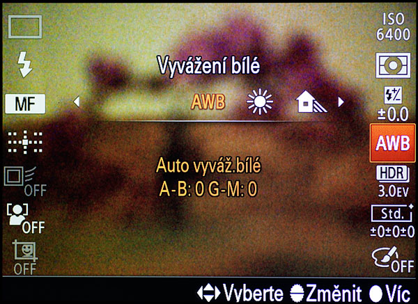 Standardním je i tlačítko Fn, které zobrazí na LCD ve dvou sloupcích po krajích displeje nabídku funkcí, které nemají (i mají) samostatné tlačítko. Pro výběr funkce slouží zadní křížový volič. Předním nebo zadním kolečkem nastavujete parametr funkce. Pokud u navolené funkce chcete změnit její dílčí nastavení, stisknete středový volič a opět předním voličem nastavíte příslušnou hodnotu.