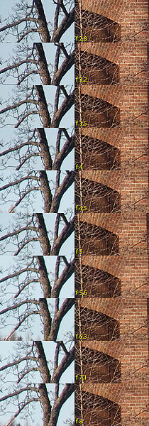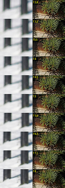 Následuje ukázka vlivu clony na bokeh (rozostření mimo hloubku ostrosti) a kresby ve středu a v rohu snímku při všech možných clonách. Pro bokeh jsem použil fotografii s ohniskem 200mm, vzdálenost cca 15m, rozostřená oblast cca 30m. V ukázce je levý horní roh a střed snímku. Druhou ukázkou je vliv clony na kvalitu kresby v rohu snímku (levý roh) a střed snímku při nejširším ohnisku 28mm. Třetí ukázkou je to samé ale při nejdelším ohnisku 300mm.