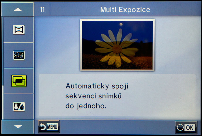 Nabídka expozičních programů je standardní, P – programová automatika, A – preference clony, S – preference času a M – manuál a iAUTO – plná automatika. Dále tu máme nabídku scénických programů – SCN, kdy máte možnost si vybrat z 12 nastavení pro určitá témata. Jak už jsem se pozastavoval při minulé recenzi u E-M1 je otázkou, zda je nutné tolik různých „motivů“, ale je to věcí výrobce. Kdo má o tato nastavení zájem, určitě si to své oblíbené najde. Stejně tak možná funkce panorama by mohla být samostatnější a ne umístěna uprostřed těchto kreativních programů. Za zmínku stojí program multiexpozice, kdy můžete snímat dva snímky „na jedno políčko“ a využít jí tak k svému kreativnímu hraní :). Dále můžete snímky doplnit různými nastaveními, jako rámečky, tmavá a světlá vinětace a dalšími efekty.