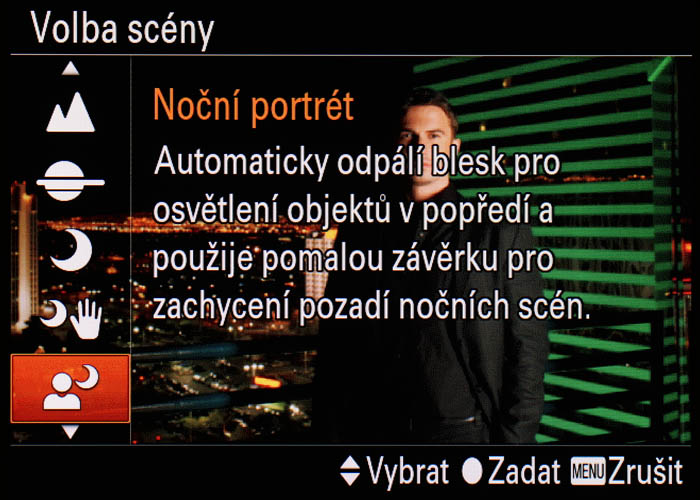 Na výběr je velké množství (mnou nikdy nepochopených) kreativních stylů: Standardní / Živé / Neutrální / Průhledná / Hluboké / Lehký / Portrét / Krajina / Západ slunce / Noční scéna / Podzimní listí / Černá a bílá / Sépie / Style Box .. Z volby scény mě osobně zaujal pouze „ručně držený soumrak“, kdy můžete dělat snímky relativně potmě bez použití stativu. Funkce pracuje na podobném principu jako vícenásobné ISO, skládáním snímku ze série cca 3–4 snímků, které se naexponují v rychlém sledu za sebou.