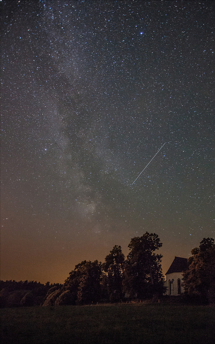 Canon EOS 5D Mark II, objektiv Canon EF 16–35mm/f 2,8L II, ohnisko 18mm, f 3,2, čas 30s, ISO 5000, kontrast zvýšen lokálně v programu Lightroom funkcí Clarity, kostel přisvícen baterkou