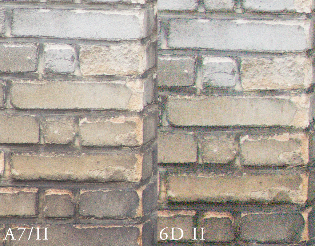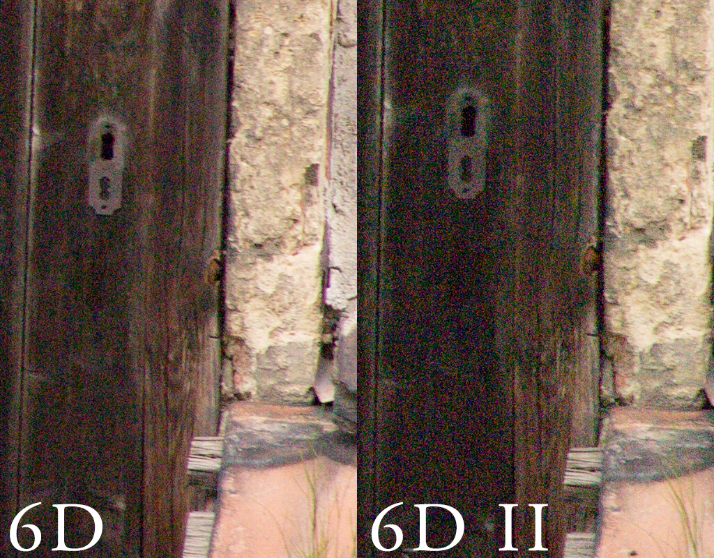 Řekl bych, že výkon obou fotoaparátů je srovnatelný. Tedy dostatečné dobrý pro většinu uživatelů, ale pozadu za konkurencí (včetně té „stájové“). Na 100% výřezech má 6D II šumu dokonce zdánlivě více, ale jde o větší přiblížení díky vyššímu rozlišení (26 vs. 20MPx). Vzhledem ke svému rozlišení dávají tedy senzory podobný výsledek.