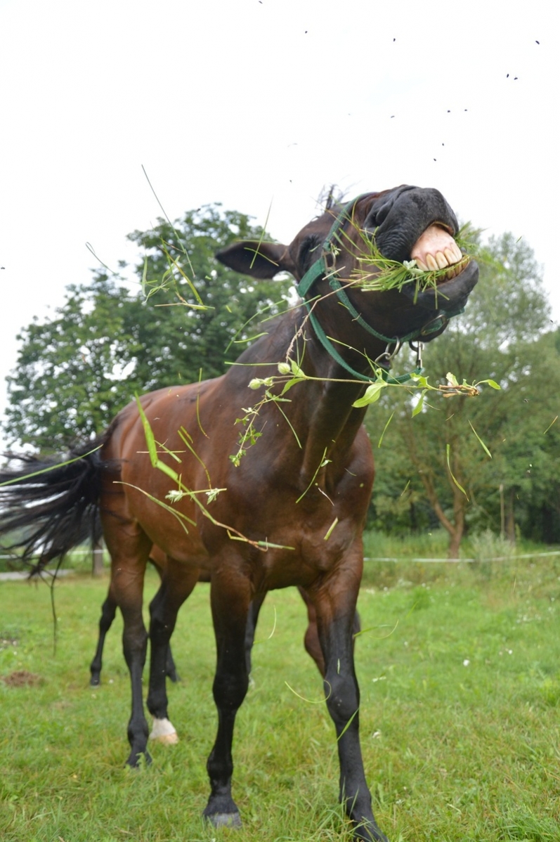 Tyto fotografie jsou dílem postřehu a rychlé reakce fotografa. První, decentní, fotografie páru vyzdobených koňů v zápřahu, kde jenom pravý si dovolil drobný úškleb. Uprostřed, dynamická, koně divocha s rozlétanou trávou. A vpravo, širokoúhlým objektivem zdeformovaná, s koněm mlsalem.