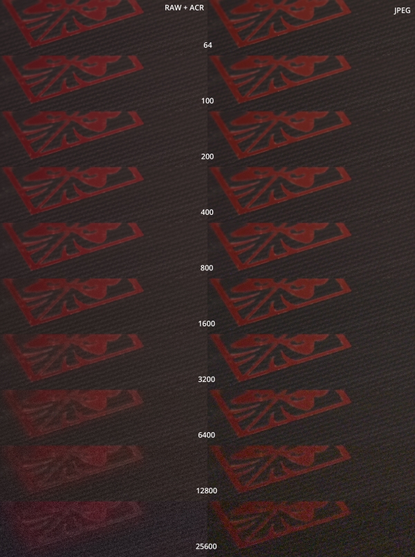 Na hodnotách ISO 400, 800, 1600, 3200 a trošku i 6400 lze v levém spodním rohu u JPEG výstupu pozorovat světlý bod, který RAW výstup ve výchozím nastavení z ACR odstranil. Něčeho podobného jsme si mohli všimnout už na přechozích fotografiích, kdy se na fotografiích vyskytují extrémně vypálené pixely. Na druhou stranu došlo k obrovskému zlepšení zpracování JPEG-u, oproti předchozím modelům D800 a D810, při ISO 12800 a 25600. Ve srovnání RAW a JPEG-u se povedlo Nikonu odstranit barevný posun a zároveň znatelně zaostřit detaily. U D810 byl barevný posun při ISO 25600 znatelný i u JPEG-ů.