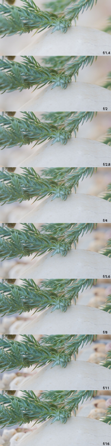 Ztmavení rohů se u testovaného objektivu pochopitelně objevuje, ale vzhledem k vysoké světelnosti není na prvním snímku (f/1.4) moc velké. Druhý snímek (f/2.0) je mnohem lepší a dá se označit za bezproblémový. Poslední snímek (f/2.8) už je v podstatě bez vinětace.