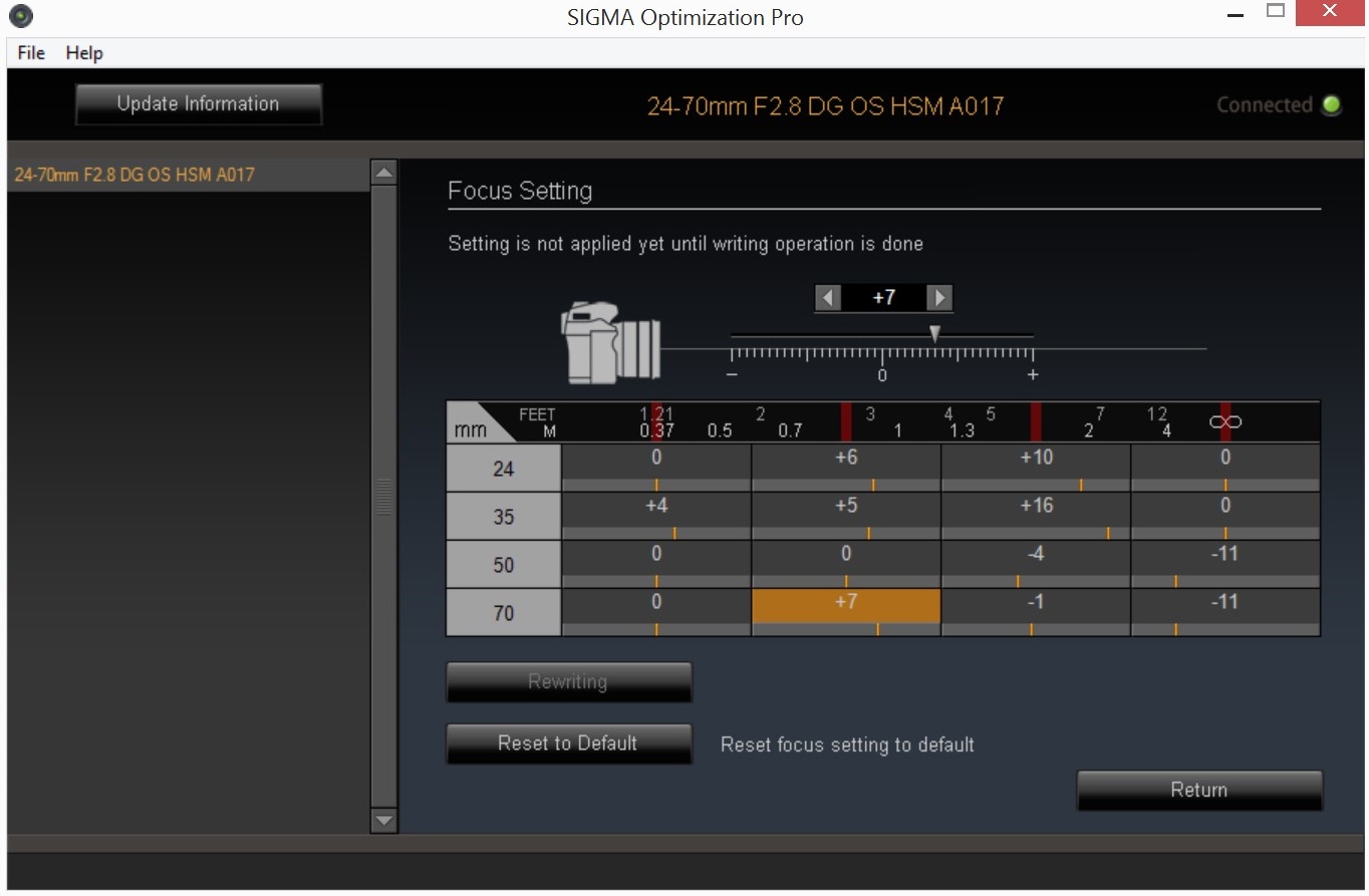 Když objektiv seřídíte, je potřeba nastavení uložit do objektivu. Ten následně můžete odpojit a nasadit na fotoaparát. Následuje kontrola, jak moc seřízení pomohlo či nepomohlo. Na kontrolu je nejlepší si vytisknout ostřicí obrazec, a to hned čtyřikrát pro všechny vzdálenosti a měřit je ze stativu.