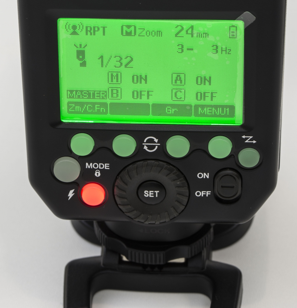 Tlačítko Mode slouží k přepínání režimu i-TTL/M/RPT (stroboskopický mód), pod ním se nachází ruční odpálení blesku a uprostřed je kruhový volič, přes který se nastavují hodnoty a uprostřed má potvrzující tlačítko SET.