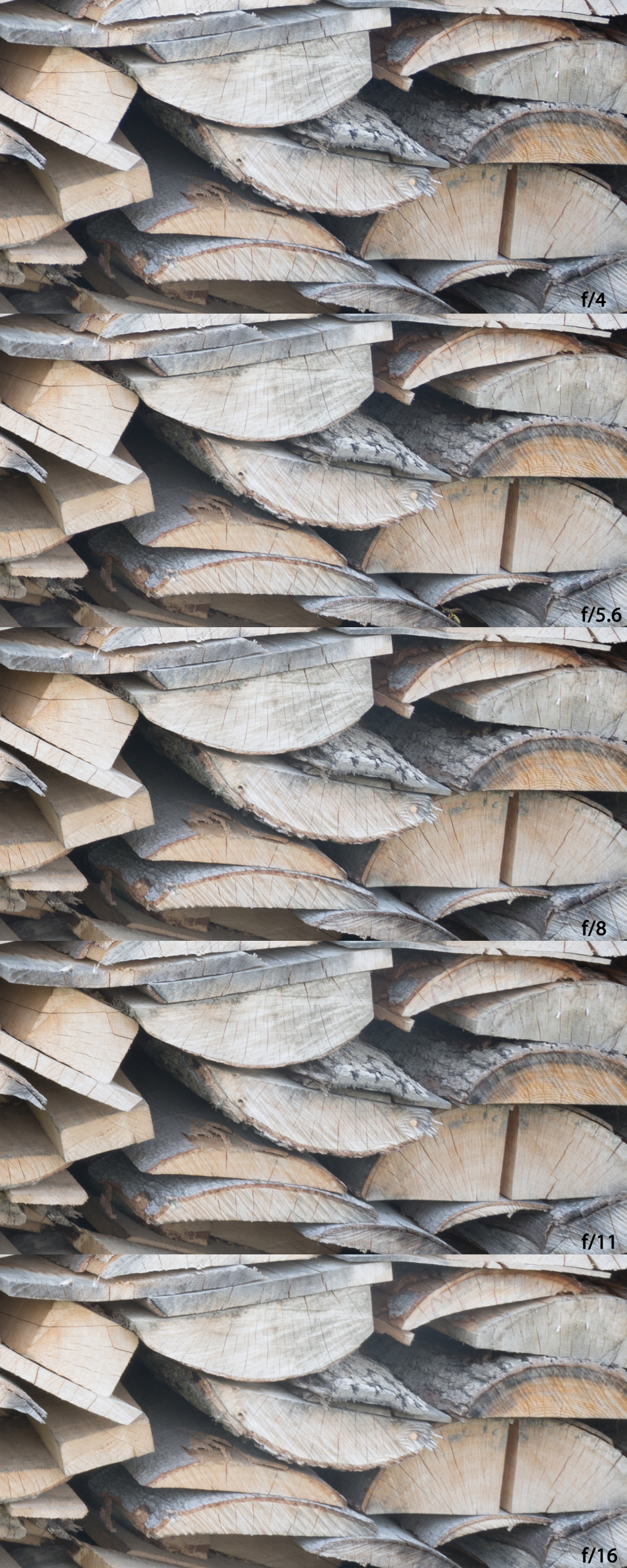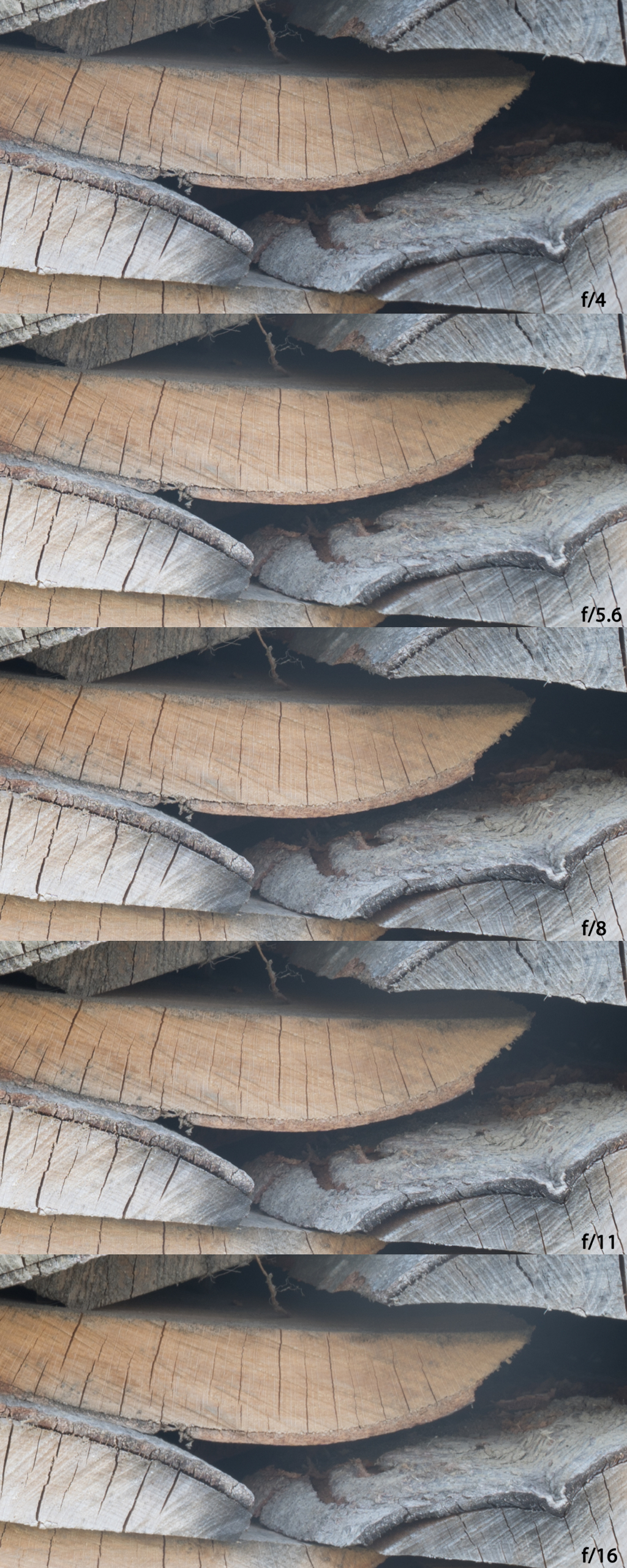 Nejprve se podíváme na širokoúhlé ohnisko 24 mm. Na středu je kresba velmi dobrá již od plně otevřené clony, s přicloněním na f/5.6 se ještě mírně zlepšuje a je výborná až po f/11, kde se následně objevuje difrakce. V okrajích je situace velmi podobná – kresba je slušná už na f/4, zlepší se po přiclonění na f/5.6 a je velmi dobrá až po f/11.