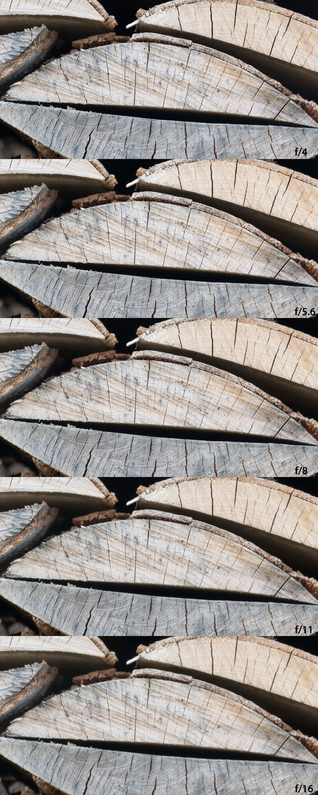 Celkově objektiv nabídne překvapivě vyrovnané výkony po celé ploše obrazu při různých ohniscích i clonách. Obecně platí, že na f/4 je obraz velmi dobrý a přiclonění na f/5.6 trošku pomůže, a to hlavně rohům, které mají tendence ztrácet trošku kontrastu při zoomování. Mezi f/11 a f/16 se začíná ve všech případech objevovat difrakce.