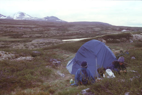 Stan se spacáky jsme nechali na místě. Asi po hodině jsme dorazili zajímavou cestou podél říčky k jezeru Rondvatnet s chatou. Kolem poledne jsme v silném větru zahájili cestu na vrchol. Cesta vede rozsáhlými suťovisky. Naštěstí nepršelo. Asi po hodině stoupání jsme potkali českou výpravu (pozn. nikdo jiný v takovém počasí nechodí), z níž většina výstup vzdala.