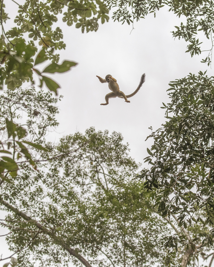 V okamžiku, kdy se přes říčku, rozhodla přeskákat tlupa kotulů veverkovitých, pevné sklo bylo k zbláznění. Odhadem bylo kotulů asi dvacet. Létali mezi stromy rostoucích na opačných březích. Na opice ve vzduchu šanci, kdy nevíte odkud která skočí, jsem jednoduše neměl. Proto jsem se soustředil spíše na statické snímky po přistání, kde jsem mohl využít světelnost a výbornou kresbu své „kovadliny“ Canon EF 300mm f/2,8 L IS I.