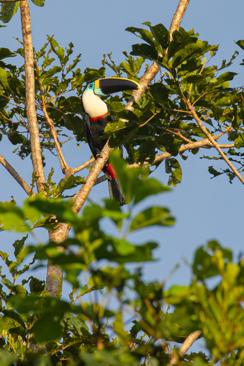 Tady v národním parku Cuyabeno zvířata nekrmí ani u lodží. Tukana jsme několikrát viděli při přeletu, ale tohle je jediný snímek, co se povedl. Zase zazářila Helena se svým zoomem Canon EF 100–400mm f/4,5–5,6 IS L II, který měla v pohotovosti.