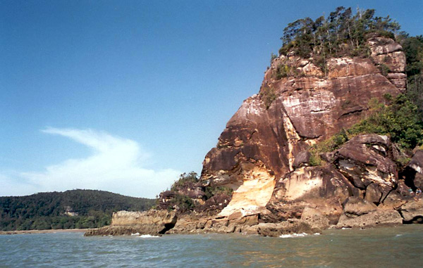 Každou chvilku bychom měli narazit na vodopády s jezírkem a těšíme se na osvěžení ve vodě. Tak jsme tady, ale voda v jezírku má podezřelou cihlovou barvu, nemáme odvahu do ní vlézt. Nebojíme se krokodýlů – ti by tady být neměli, ale neviditelných parazitů. Naše trasa vede až na pláž, tam skočíme do moře a bude nám fajn. Prodíráme se dál džunglí, fotím další masožravky a květiny, které vidím. Občas uslyším podezřelý šelest a mám docela strach, že nás přepadne hejno opic a roznesou nám naše věci po stromech, nebo narazíme na rozběsněné prase bradavičnaté, či se na nás ze stromu spustí nějaký had škrtič. Naštěstí slyším vřeštění opic jen z dálky, sem tam něco poblíž nás zašustí, ale nic se neděje. Už cítíme moře a zrychlujeme krok, mám chuť odhazovat věci co mám na sobě a vběhnout přímo do vody…. je odliv…… moře se třpytí desítky metrů od nás a před náma je jen písčito-bahnité pole. Z koupání nic nebude, musíme se spokojit jen s odpočinkem na pláži. Je tady spousta zajímavých kamenů a skalisek vytvarovaných mořem. A ještě něco…..malí živočichové hopsající v písku – mudskipper. Je to taková malá srandovní rybka, odrážející se ploutvičkama a poskakující po bahně. Bavím se jejich naháněním, moc fotogenické nejsou, ale aspoň malý vizuální úlovek mít musím.