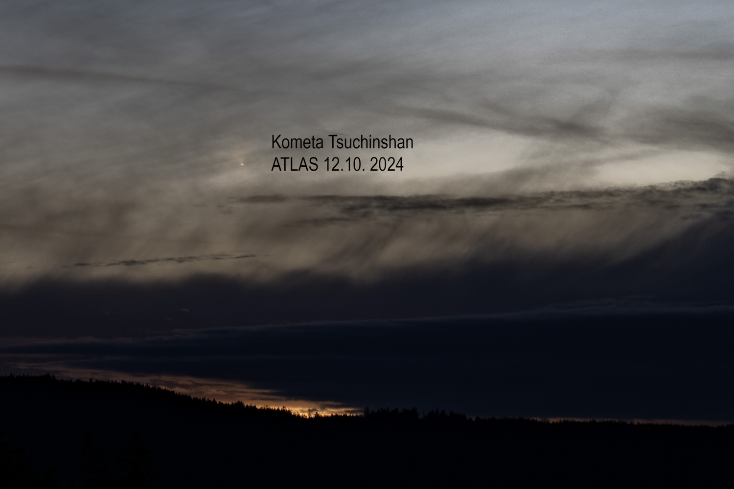 Kometa se nacházela za Sluncem od 9. so 11.října 2024. Poprvé jsem ji vyfotografoval přes hustou oblačnost 12. října, kdy byla velmi jasná. Vzal jsem to cestou ze Sušice ze Šumavského fotofestivalu a fotomaratonu.