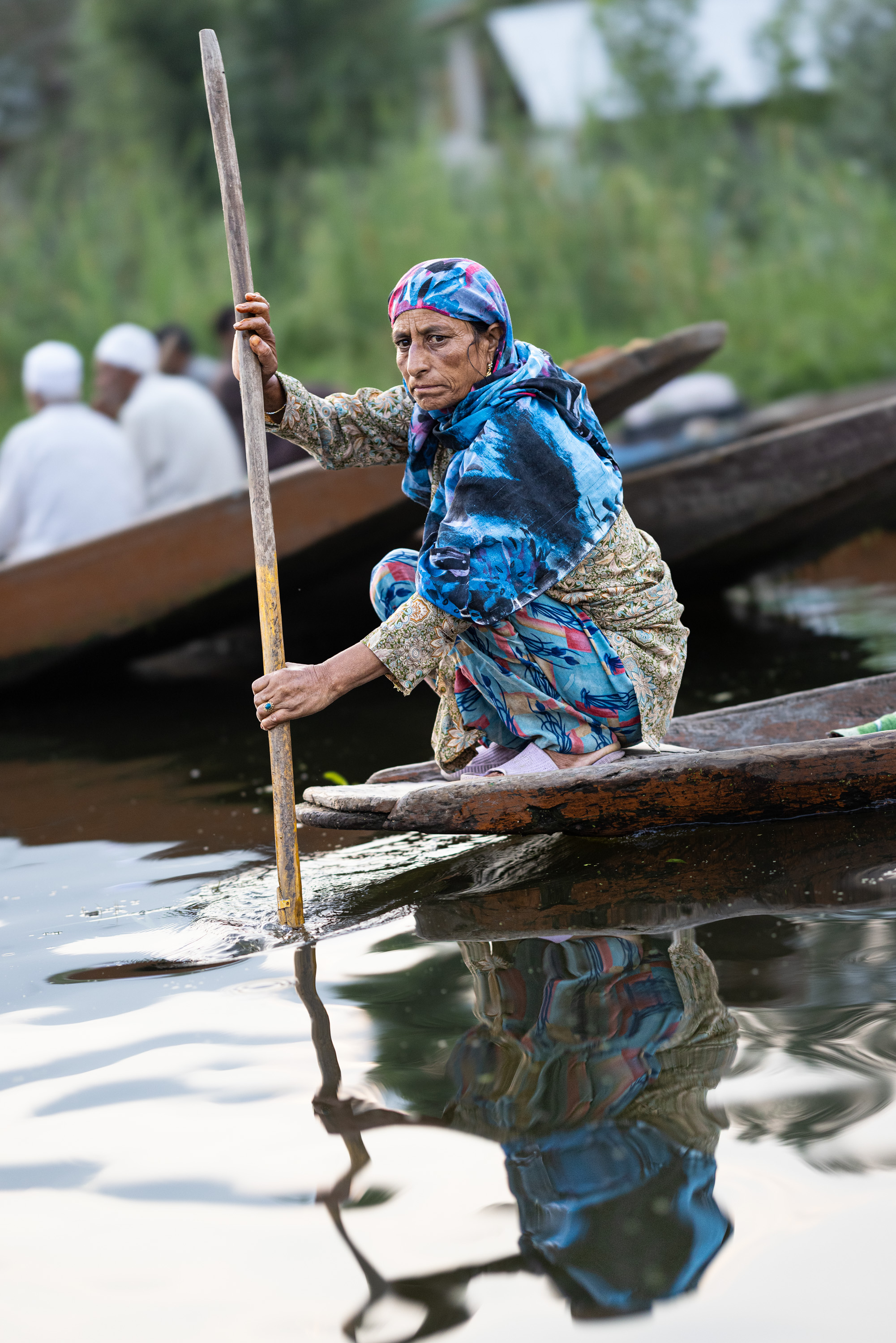 Muslimská žena na jezeře Dal, Kašmír, Indie