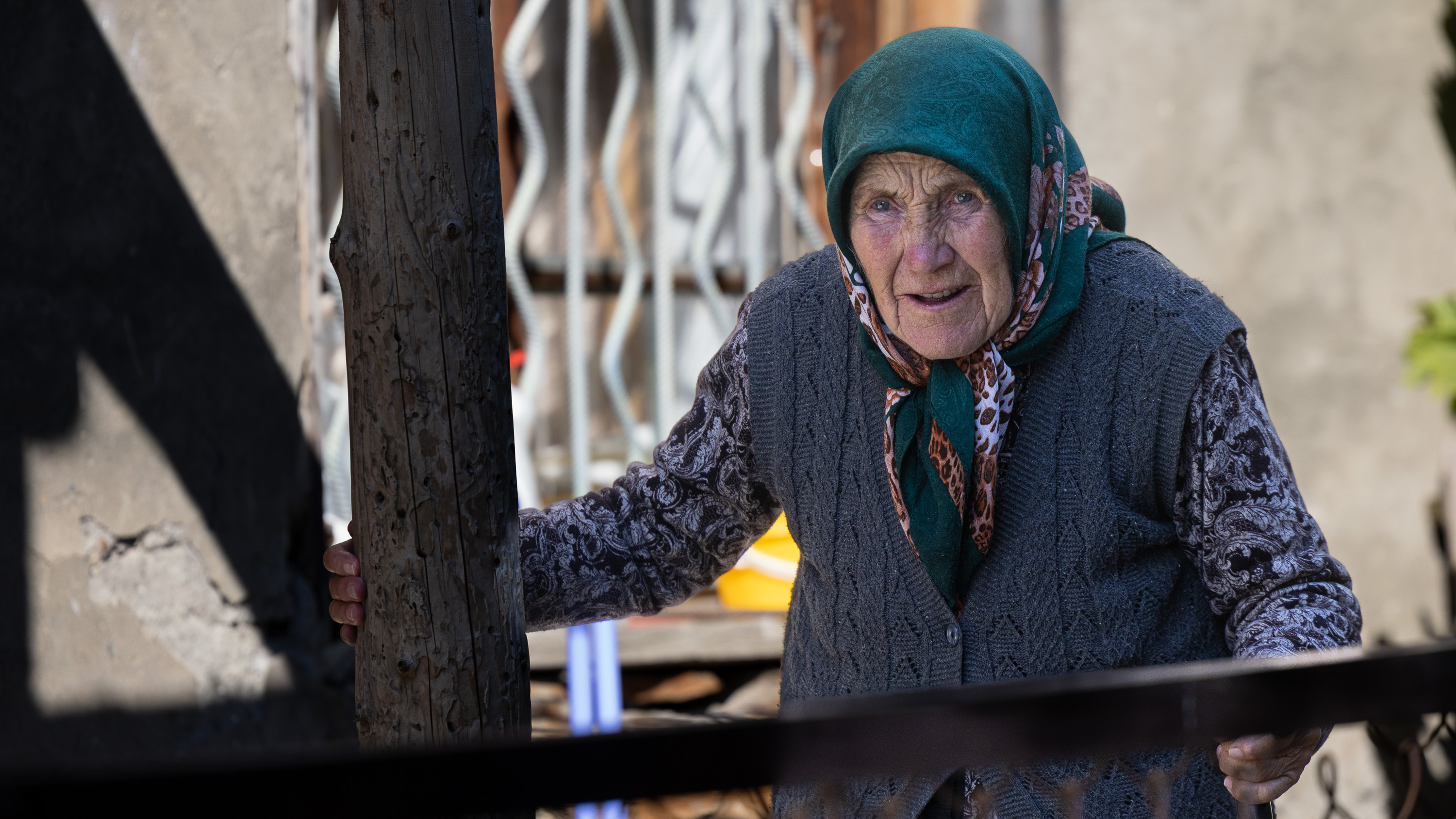 Babky seděli u domu ve stínu a klábosily. Přišel jsem k nim, ale fotografování odmítly. Já to ale nevzdal. Po čas se rozešly a já si natáhl zoom na 200mm. Musím říci, že mě v dálce viděly, ale moje ostření díky špičkovému vybavení fungovalo jako blesk,
