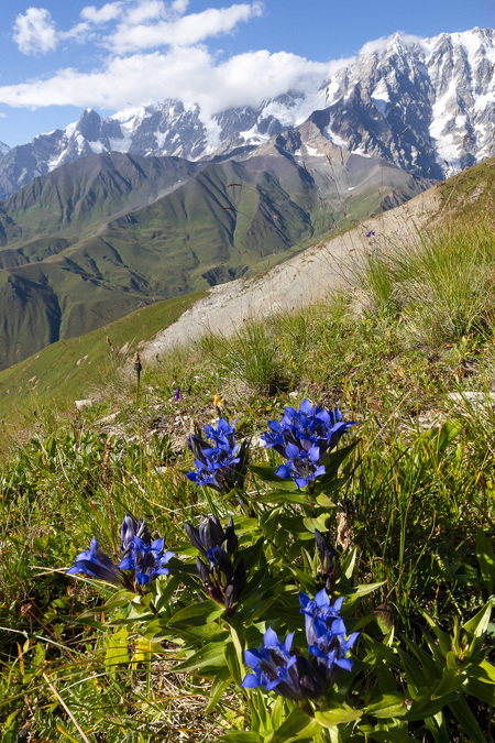 Kavkazský hořce s hlavním hřebenem v pozadí, Svanetie