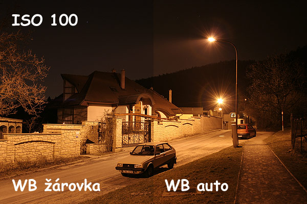 Na ukázce č.24 je celkový pohled na testovací noční scénu. Snímek je složen ze dvou shodných polovin, kde jediným rozdílem je použité nastavení vyvážení bílé barvy. Levá část snímku je nastavena na žárovku (která je žlutým výbojkám na snímku asi nejblíž) a pravá je ponechána na automatice. Snímek lze stáhnout i v plné velikosti s jedinou úpravou v podobě spojení dvou odlišných polovin. Rozdíl mezi oběma polovinami je zcela minimální, z čehož lze usuzovat na výbornou funkci automatického vyvážení bílé. Nyní už k samotnému srovnání úrovně šumu při jednotlivých citlivostech ISO.