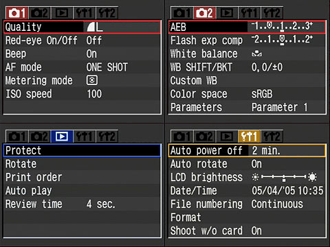 Pomocí různých funkcí lze nastavovat i řadu falších parametrů. Důležité je například vyvážení bílé barvy, které je důležité při fotografování do formátu JPEG při specifických druzích osvětlení. Aparát umožňuje automatické vyvážení a předvolby pro osvětlení sluncem, objekty ve stínu, při zamračené obloze, při použití blesku či žárovkovém a zářivkovém světle. Nechybí ani možnost manuálního změření bílé pomocí speciální funkce a naměřená hodnota vždy do další změny zůstává uložena v paměti. Nastavit lze také kontrast, saturaci, tónování a doostření. Tyto hodnoty je možné dokonce uložit do tří nezávislých pamětí. Můžete dokonce vybrat jeden ze dvou barevných prostorů – sRGB nebo Adobe RGB. Velkou pozornost pak zasluhuje velmi povedený černobílý režim, převzatý z modelu vyšší kategorie EOS 20D. Nejenže je možné pořizovat černobílé fotografie (D-SLR to donedávna neumožňovaly vůbec), lze je také tónovat do populárního sépiového odstínu, ale i do modré, růžové či zelené. A to ještě pořád není všechno, aparát má i vestavěnou softwarovou imitaci klasických filtrů pro černobílou fotografii. Je možné zvolit ze čtyř nejobvyklejších filtrů, které jistě dobře znají všichni ti, kteří začínali klasickým filmovým černobílým procesem. Filtry jsou žlutý, oranžový, červený a zelený. Ukázky všech možností nastavení filtrů pro černobílou fotografii pak najedete na ukázkových snímcích č.28 a 29.