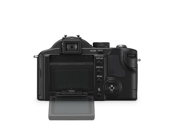 Na dolní straně je prostor pro baterii. Při vyndavání dejte pozor na její vyskočení. Raději ji přidržte. Kovový stativový závit je přesně v ose objektivu. Ničemu nebrání, nelze mu nic vytknout. Zadní straně dominuje 2" LCD displej. To se sice může zdát málo, ale nahrazuje to dostatečně rozlišením 230 000 bodů a možností vyklápění a otáčení, jak ukazují obrázky. Na zadní straně najdete také tlačítko blokování expozice, tlačítko LCD/EVF pro přepínání zobrazení z LCD do hledáčku, tlačítko DISPLAY pro určení množství zobrazených informací, tlačítko MENU se standardním významem, tlačítko pro mazání snímků a vícepolohové tlačítko s volbou bracketingu, režimu rychlého prohlížení, režimu blesku a samospouště. Na levé straně najdeme přepínač ostření z normálního na makro a manuální. Pod ním je tlačítko automatického zaostření v manuálním režimu. Posledním ovládacím prvkem na levé straně je tlačítko na vyskakování blesku.