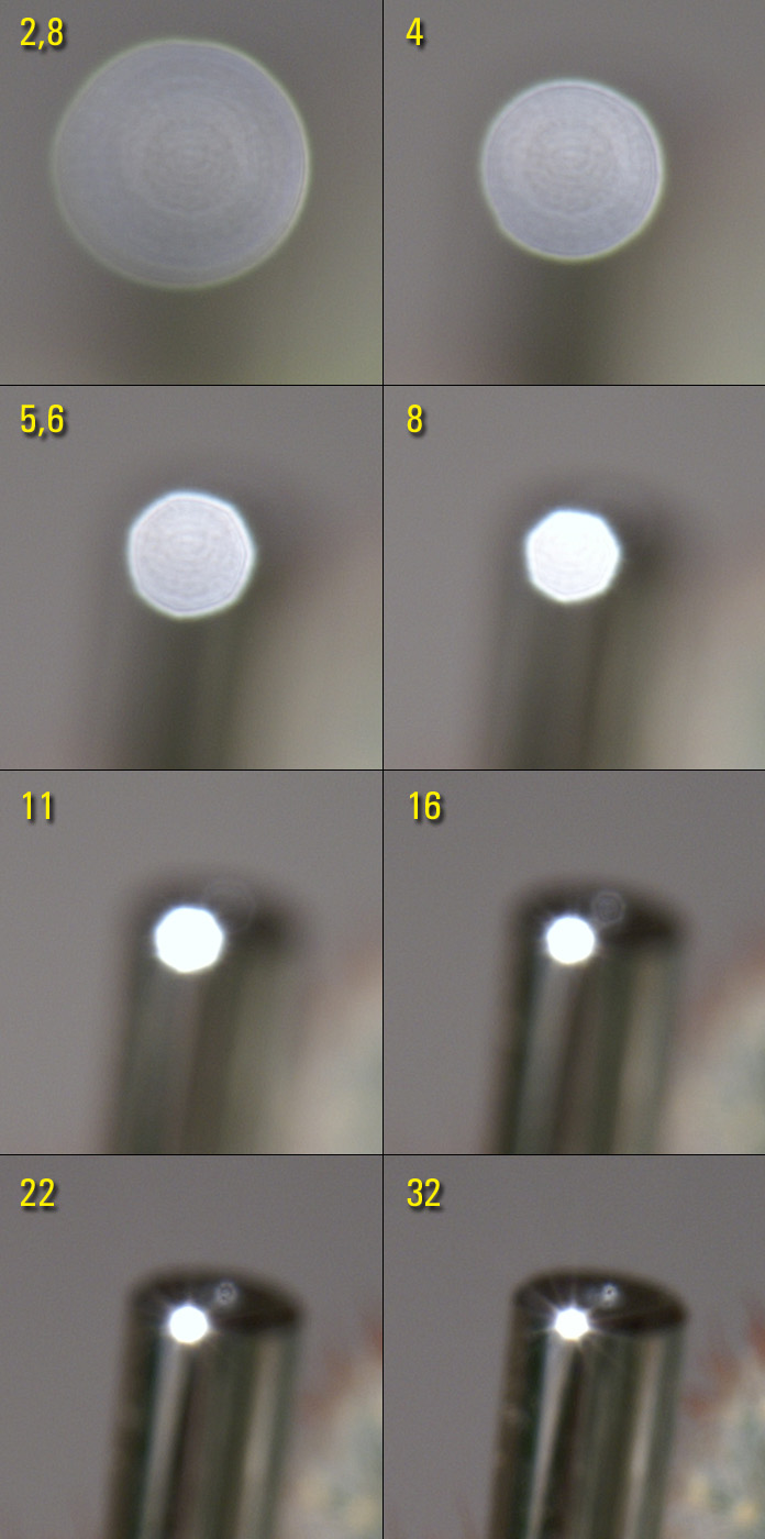 Následující snímky ukazují vliv clony na kresbu objektivu a to jak v ostřené rovině ve středu snímku, tak i v rohu a také v bokehu (oblast mimo ostřenou rovinu), kde je navíc umístěn lesklý předmět, který simuluje odraz světla. Nejprve zmenšené snímky celé kompozice s nejmenší clonou 2,8 a největší clonou 32.