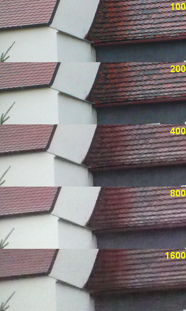 Použitelné do ISO 400 (navíc výrazný barevný šum na šedých plochách i při ISO 100)