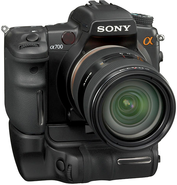Pogumovaný bok má i horní kruhový ovladač. Stejně tak je na první pohled zřejmé, že oproti soustavě zrcadel, která přenášela obraz do hledáčku Alphy 100, má Alpha 700 pevně vestavěný pětiboký hranol schovaný v horní části před umístěním vestavěného blesku, který se tradičně vyklápí ručně. Typický styl – dva kruhové ovladače na horní straně, se poněkud změnil v tom, že zůstal pouze jeden kruhový ovladač a funkce z druhého ovladače se přestěhovaly do samostatných tlačítek na horní nebo zadní stěně. Kruhový ovladač s možností nastavení expozičních programů se trochu netradičně přesunul na levou stranu. Zbylé ovládání je rozmístěno na známých místech na horní a zadní ploše.
