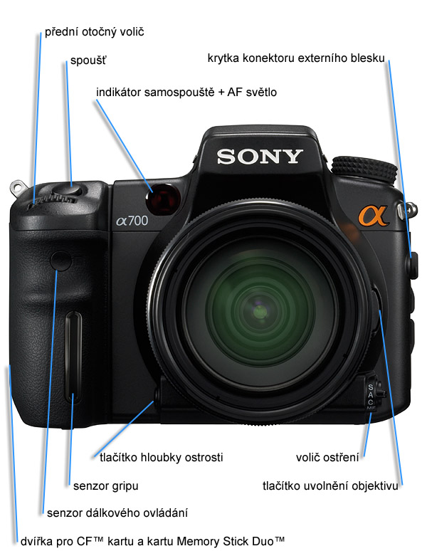 Jak už jsem psal v úvodu, u bývalé Minolty patřila sedmičková řada k tomu nejlepšímu a Sony jde na to stejným krokem. Již první pohled na Alphu 700 ukazuje jak velký posun se od nedávné Alphy100 udělal a že Alpha 700 není ani tak pokračovatelem, ale že se jedná spíše o přístroj patřící do vyšší třídy. Tělo Alphy 700 je robustnější, má poněkud hranatější tvar, ale s elegantním zaoblením. Fotoaparát je příjemně těžký a dává tak najevo, že to rozhodně není plastová hračka. Základním materiálem těla je magnézium s šasi z hliníkové slitiny s ovládacími prvky utěsněnými proti prachu a vlhkosti. Povrch má jemně zdrsněnou strukturu s matným provedením černé barvy, které „narušuje“ pouze výrazné oranžové logo „α“ a kovový široký kroužek bajonetu. Pogumované je pouze masivní madlo z přední strany a na zadní straně místo, kde se opírá palec pravé ruky.