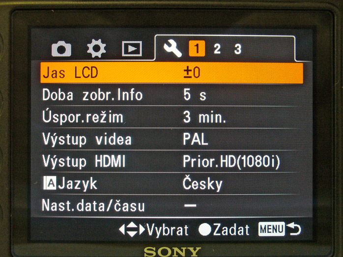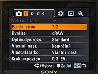 Menu je řešeno standardně jako u předchozích digi přístrojů. Je přehledné, rozdělené na 4 základní skupiny, vyjádřené graficky jako karty: Záznam, prohlížení, uživatelská nastavení a nastavení přístroje. Každá má svoji typickou barvu. Je výhodné, že Sony používá stejný styl jako používala Minolta. Přepínání mezi „kartami“ je velmi rychlé a přehledné a vše probíhá stále na jedné stránce, takže máte neustále přehled, kde se nacházíte a nehrozí bloudění stylu „safra, kde to v tom MENU bylo“. V ukázce vidíte, jak jednotlivé karty vypadají.