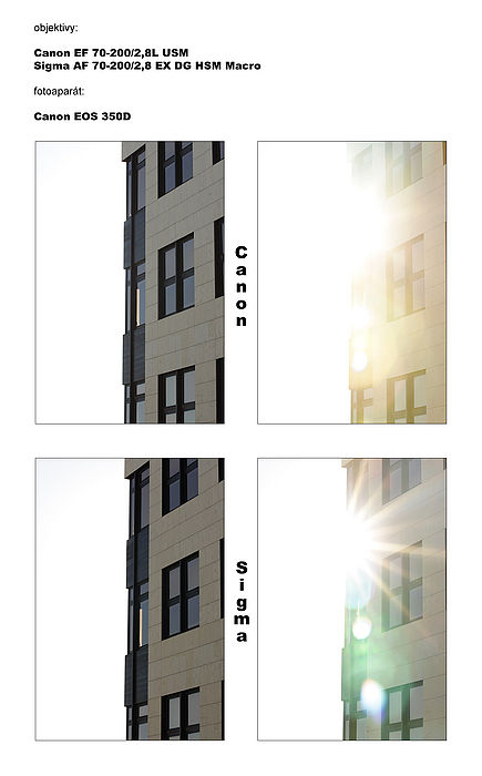 Len taka poznamka, osobne by som sa nedivil ze je canon horsi v protisvetle kedze ide v podstate o najstarsi model z rady 70-200 tympadom nemozeme od neho cakat take kvalitne antireflexne natery na sosovkach ako ma napr sigma ktora je o par rokov novsie sklo. Osobne mam tuto sigmu a pri zacloneni na f4 a viac je velmi dobra, zistil som vsak ze jej najvacsia slabost je macro, resp. pri zaostrovani na male vzdialenosti a dlhom ohnisku sa obraz stava velmi makkym, plati to vzorec ze cim dlhsie ohnisko a cim blizsie je objekt tak tym je maksi a co mi vsak osobne nevadi kedze radsej fotim macro s plnokrvnym macro sklom. Inak je ostrost OK, hlavne na vacsie vzdialenosti ako 1.5m takze napr portrety su OK! Co sa tyka AF tak je rychly a tichy nema problem ani v servo mode a v pohode stiha aj sport, avsak je trochu na skodu to ze moj dslr v kombinacii s touto sigmou pravdepodobne trpi front focusom co sa prejavuje pri malych DOF a ze obcas sa AF netrafi co vo vyslednom meritku moze sposobit ze sa objektiv zda neostry. Nejde vsak o opticku vadu ako skor o mechanicku, kedy proste AF netrafi tam kde by som chcel a fotka je neostra. Kedze nemam dslr s moznostou micro adjustment, po prechode na novsie telo si jednoducho doladim AF. chromaticka vada mi tiez neprekaze kedze fotim do RAW tak je to sekundova zalezitost...