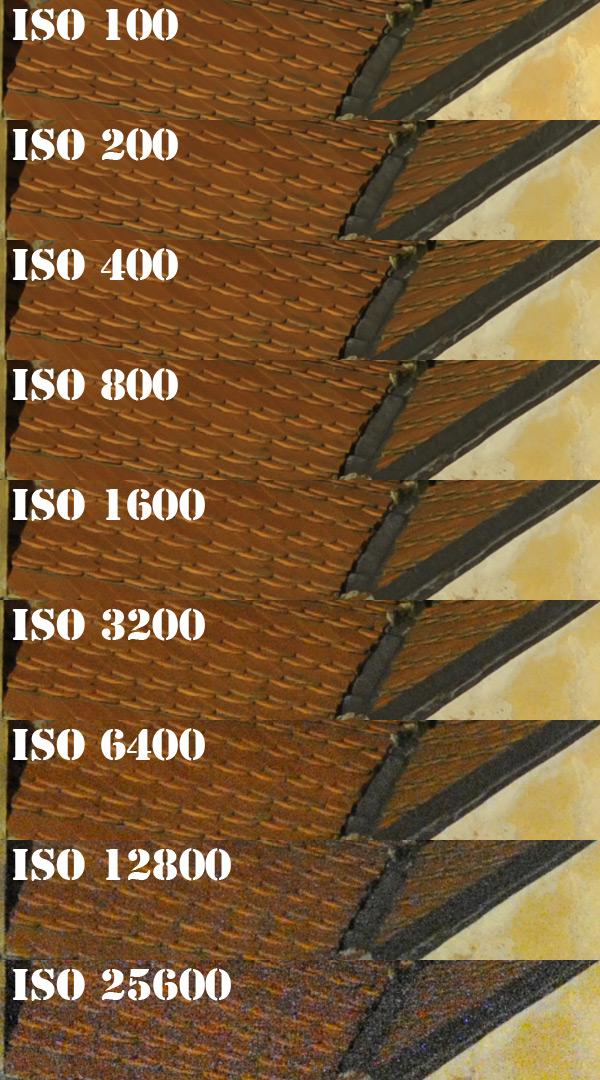 patrné až při citlivosti ISO 12800. Při rekordní citlivosti ISO 25600 je