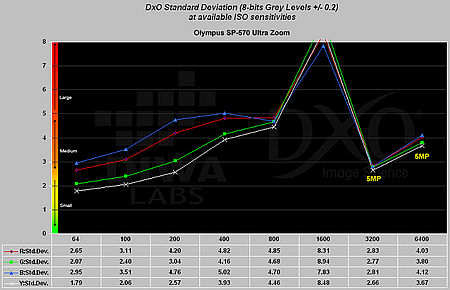 Nyní se podívejme na výsledky laboratorních testů obrazové kvality, provedené v laboratoři asociace DIWA, jíž je FotoAparát.cz členem. Porovnejeme je s výsledky Olympusu SP570, který spadá do do téže kategorie.