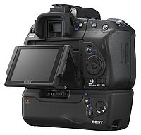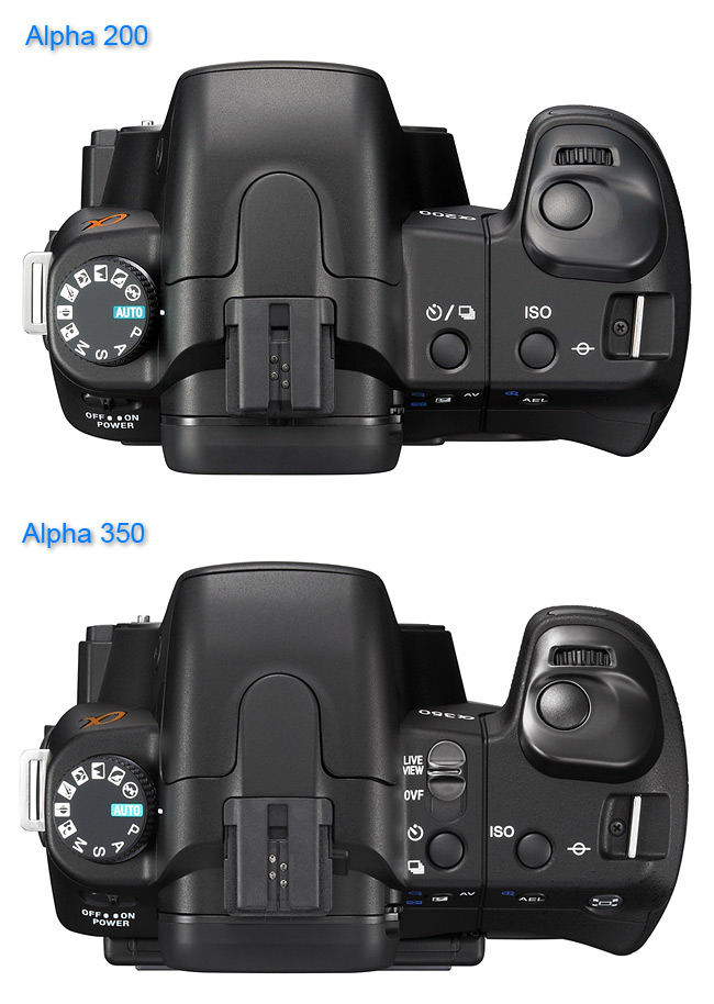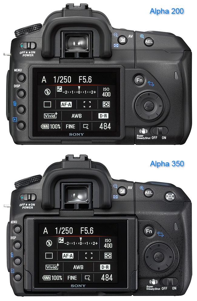 Tělo je o oproti předcházejícím DSLR (A100) o 5mm vyšší, takže malíček pevně drží a již nesklouzává pod fotoaparát. Madlo je dostatečně vysoké i široké, i když lidé s velkými prsty nohou mít trochu problémy. Nevím, co vedlo výrobce k tomu, že tvar madla zjednodušil a již není tvarované prolisem pro prostředníček, ale je rovné až dolů. Osobně mi tento prolis na A200 vyhovoval. Krytka baterie je ve spodní části a podobně propracovaná jsou i dvířka na pravém boku, pod kterými se schovává slot pro CF kartu a USB konektor. Jediná gumová dvířka jsou pro dálkovou spoušť a konektor pro připojení nabíječky AC-VQ900AM pro dva akumulátory. Na obrázcích níže vidíte porovnání A350 s A200.