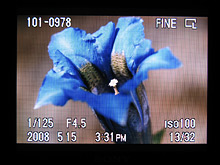 Dobu podsvícení LCD je možné ovlivnit v uživatelském nastavení a šetřit tak energii akumulátoru. Fotoaparát automaticky reaguje na polohu přístroje a informace o nastavení při záznamu se tak překlopí o 90° doleva či doprava, tak aby byly vždy vodorovně a tím dobře čitelné. Platí to ale pro zobrazení v režimu záznam, ne pro MENU. Snímky lze prohlížet samotné, s informacemi nebo i s novým RGB histogramem umožňující ověřit expozici kanálů červené /zelené/modré barvy. Při tomto prohlížení se také zobrazují informace o rozložení jasů. Znamená to, že místa, která jsou buďto černá, nebo čistě bílá na LCD blikají a vy máte hned přehled o tom, jak se snímek povedl.