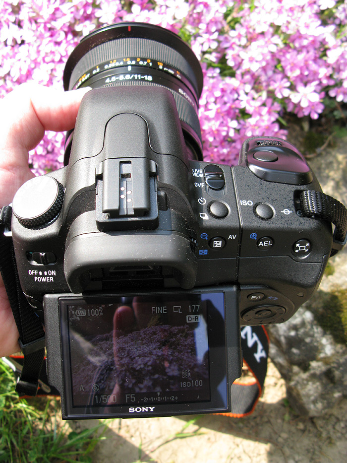 I zde však některé věci působí spíše rozpaky. Sice tímto řešením šetříte hlavní snímací čip, ale znamená to že jedním čipem se díváte a druhým fotíte. Otázkou je, zda horní malý čip zobrazuje náhled stejně, jak poté bude hlavní čip exponovat fotografii. Nevýhodou malého čipu je poměrně velké „šumění“ živého náhledu, které se ještě zvyšuje při zhoršených světelných podmínkách. Proto fotografování za zhoršených světelných podmínek pomocí LV v kombinaci s manuálním ostřením, třeba objektiv Sony 135mm F2,8 [T4.5] STF je tak poněkud velmi obtížné. Na co výrobce také zapomněl je i minimální antireflexní úprava LCD. Znamená to že často vidíte v LCD více sebe a okolí za vámi, než snímaný obraz to i v případě že jas LCD nastavíte na maximum. Ostatně nastavení jasu na maximum doporučuji natrvalo, jinak při slunečném dni na ulici máte problém prohlédnout si a zkontrolovat i naexponované fotografie. Funkci LV tak nejvíce oceníte ve stínu nebo v interiéru. Zde má výrobce opravdu co dohánět.