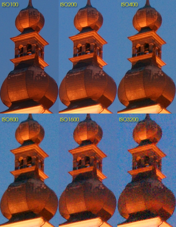 V plném rozlišení má RAW snímek 4592×3056 pixel a to stačí na fotografii o rozměrech 39×26cm v rozlišení 300dpi, případně 60×40cm při rozlišení cca 200dpi. Citlivost čipu lze nastavit v rozsahu 100, 200, 400, 800, 1600 a 3200 ISO. V následujících ukázkách vidíte, jak se velikost ISO projeví na šumu u snímku v podvečerním a nočním světle. První snímek je celková ukázka a další výřezy při jednotlivých nastavení ISO.