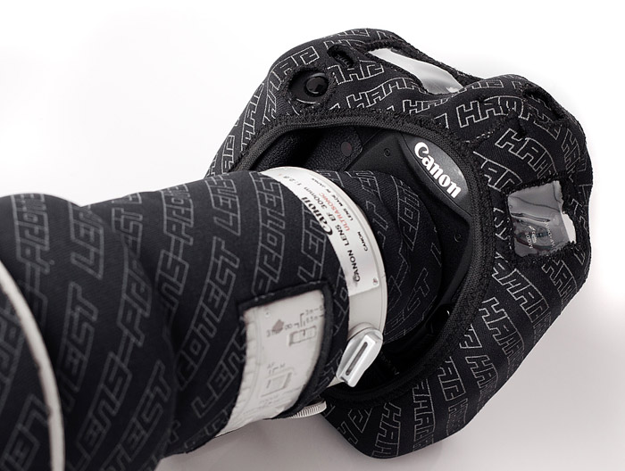 Lens-Protect (mimochodem, jeho tvůrce je z Česka) je vyrobený z 2,5 mm neoprénu černé nebo šedé barvy s potiskem, a kryje všechny spáry a škvíry mezi pohyblivými částmi na objektivu, kudy by se dovnitř mohla dostat voda, písek a tak dále. Na běžných objektivech se skládá ze dvou návleků – ten velký se natáhne na tělo objektivu, menší kroužek těsní prostor kolem bajonetu. U složitěji tvarovaných objektivů (například dlouhá pevná skla) je návleků více. Při zoomování se otáčí celým Lens-Protectem a jeho zbytek klouže po těle objektivu. Když jsem si četl informace na webu, zaujala mě i taková drobnost, jako výběr nití pro šití – nejen kvůli pevnosti, ale i proto, aby nitě nedřely a nepoškrábaly tělo objektivu. Pokud potřebujete přístup k ovládacím prvkům, lze neoprén poodhrnout. Návleky pro delší skla (300 mm a více) mají průhledná plastová okénka přes panel s přepínači.