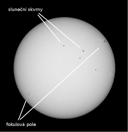 Na Slunci můžeme pozorovat např. sluneční skvrny nebo tzv. fokulová pole.