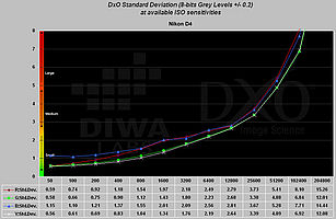 Pro objektivní porovnání NIKON D4 zařazuji výsledky laboratorních testů mezinárodní asociace DIWA, jejímž členem je i FotoAparát.cz. Z hlediska zobrazení DSLR jsou jedny z nejdůležitějších parametrů míra šumu, odstup signálu od šumu a dynamický rozsah obrazu.