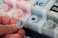 Zajímavé to je, když inkoust opravdu dojde (poznáte podle hladiny v nádržce, která se dostane pod rysku). Dolít inkoust je jednoduché, odšpuntujete nádržku a z lahvičky nalijete inkoust. Pokud nejste vyloženě neopatrní, ani kapka se nedostane mimo nádržku. Jen kontrola zda lijete správný inkoust je na Vás, inkousty můžete nalít kamkoli, u klasických náplní nešla špatná barva nasadit na špatné místo. Také, přestože podle Epsonu je doplnění inkoustu velmi čisté, buďte opatrní abyste nepřelili (pokud doplňujete ne úplně prázdnou nádržku). Pokud dostáváte z lahvičky poslední zbytky inkoustu, tvoří se u hrdla bublinky. Když pak prasknou, jsou v nejbližším okolí malé kapičky inkoustu. Výhodou je, že pokud nedoplníte celý obsah lahvičky, můžete ji znovu zašpuntovat odlomeným koncem víčka.