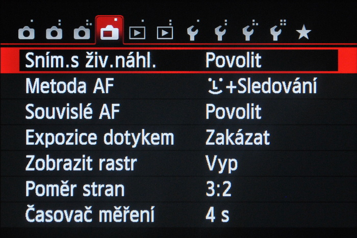 Na natáčení videa se přepnete přímo páčkou zapínání a nahrávání spustíte tlačítkem živého náhledu. Ve videorežimu sice můžete přepínat fotografické režimy, praktický význam to ale nemá. Plnou kontrolu nad nastavením máte v M, kde si volíte čas, clonu a citlivost. Dále pak WB, Picture style, Automatickou optimalizaci jasu, Efekt miniatury (zrychlený záznam), metodu AF, režim a velikost snímání pro fotografování při videu (v záznamu bude při vyfocení fotografie malý kousek chybět) a také parametry samotného záznamu – rozlišení FullHD s max. 25fps (v PAL), HD s 50fps nebo VGA. Pro nenapravitelné autory dlouhých a nudných záběrů nechybí Videomomentka, která zachytí pouze 4s záznamu. V režimech P/Tv/Av již nemáte kontrolu nad expozičními parametry a volíte pouze kompenzaci expozice. Expoziční parametry v M i kompenzaci expozice lze měnit v průběhu natáčení. Jakýkoli automatický režim při natáčení videa pouze drasticky omezí další dostupná nastavení, nemá tedy příliš smysl v těchto režimech natáčet.