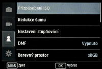Systém menu přístroje Samsung NX3000 můžete vidět níže. Menu je rozděleno do čtyř hlavních záložek, reprezentujících nastavení fotografování, nastavení videa, osobní nastavení a nastavení přístroje. Každá pak obsahuje podmenu s různým počtem dalších nastavení, ve formě nahoru a dolu rolující obrazovky. Zpracování menu je kontrastní, logika rozmístění některých nastavení pak už méně. Třeba režim AF lze nastavit v první hlavní záložce, přisvětlení AF pak v třetí. Podobně tak v první lze přepínat mezi citlivostmi ISO či zapnout automatiku, pro nastavení horní hranice automatiky či stupňování opět ve třetí. Nepovedl se ani český překlad některých položek – holt ne každý v překladatelské branži rozumí fotoaparátům, ale že si to výrobce neohlídá je škoda. Na druhou stranu díky tomu vznikají humorné položky jako „dlouhodobá redukce šumu“ (místo redukce šumu při dlouhých časech) či pak paralelně „vyskoká redukce šumu“ ta má pak nastavení mimo jiné „hlasitě“ a „potichu“:)