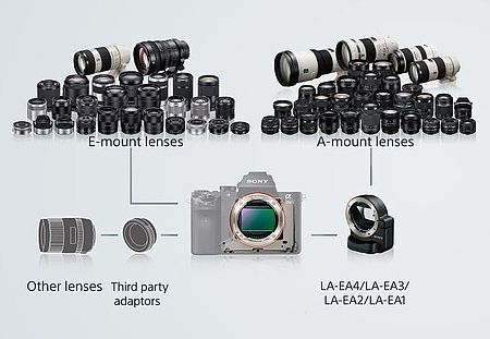 Následující obrázek ukazuje možnosti připojení různých objektivů na A7 II. Objektivy s E-bajonetem jsou plně kompatibilní, jen záleží zda jsou určeny pro Full Frame nebo pro APS-C. Stejně tak je zajištěna kompatibilita objektivů s A-bajonetem, i když k tomu potřebujete příslušnou redukci. LA-EA1 (pro APS-C objektivy a je zajištěn přenos nastavení expozice, ale pouze MF) LA-EA2 (jako LA-EA1 přenáší nastavení expozice, ale i s přenosem AF), LA-EA3 (pro Full frame objektivy, ale pouze s přenosem nastavení expozice, zaostřování MF) LA-EA4 (pro Full frame s plným přenosem expozice i AF). Případně je tu možnost použít redukce jiných výrobců, které ovšem zajišťují většinou pouze fyzické připojení objektivu k tělu. V takovém případě musíte clonu nastavit ručně, stejně tak zaostřování.