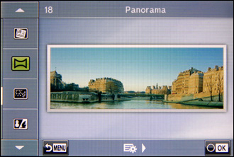 Nabídka expozičních programů je standardní jako u všech předchozích modelů. Nabídky ex.programů P – programová automatika, A – preference clony, S – preference času, M – manuální nastavování clony a času a iAUTO – plná automatika, kde vše z vás dělá fotoaparát, tak jak si sám myslí, že to bude nejlepší. Také tu máme nabídku scénických programů – SCN, kdy máte možnost si vybrat z 25 přednastavených typů jako je Portrét, e-Portrét, Krajina, Krajina+Portrét, Sport, Noční obloha, Noční scéna, High Key, Panorama… např.v režimu e-Portrét jsou ukládány 2 snímky, jen neupravený a jeden s efekty, režimy Efekt rybí oko, Širokoúhlý a Makro jsou zase připraveny pro použití s příslušnými předsádkami. V režimu noční obloha je najednou pořízeno a sloučeno 8 snímků.