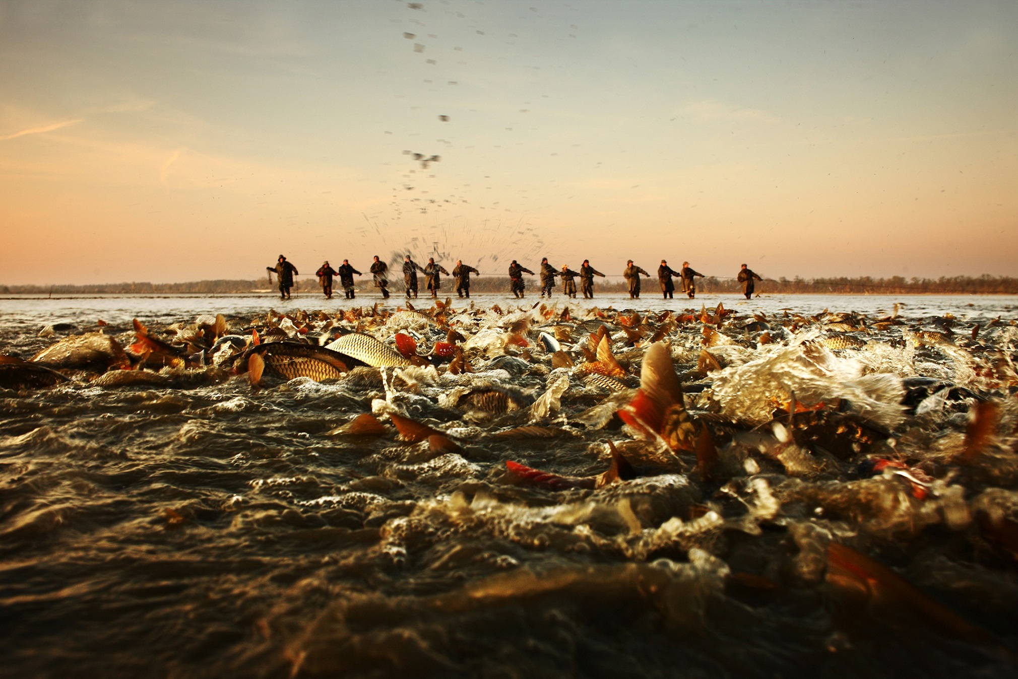 Snímek z ranního zátahu při výlovu kaprů na Zámeckém rybníce v Jaroslavicích.