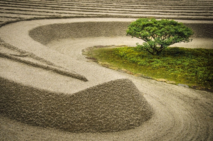 Fotografie níže vznikla v zen budhistické zahradě Stříbrného pavilónu nazývaného Ginkakuji, na fotografii vidíme japonskou kamennou zahradu, v japonštině se jí správně říká „sekitei”. Hlavní roli na této fotografii hraje prostor a pohyb, který je vytvářen točící se křivkou.